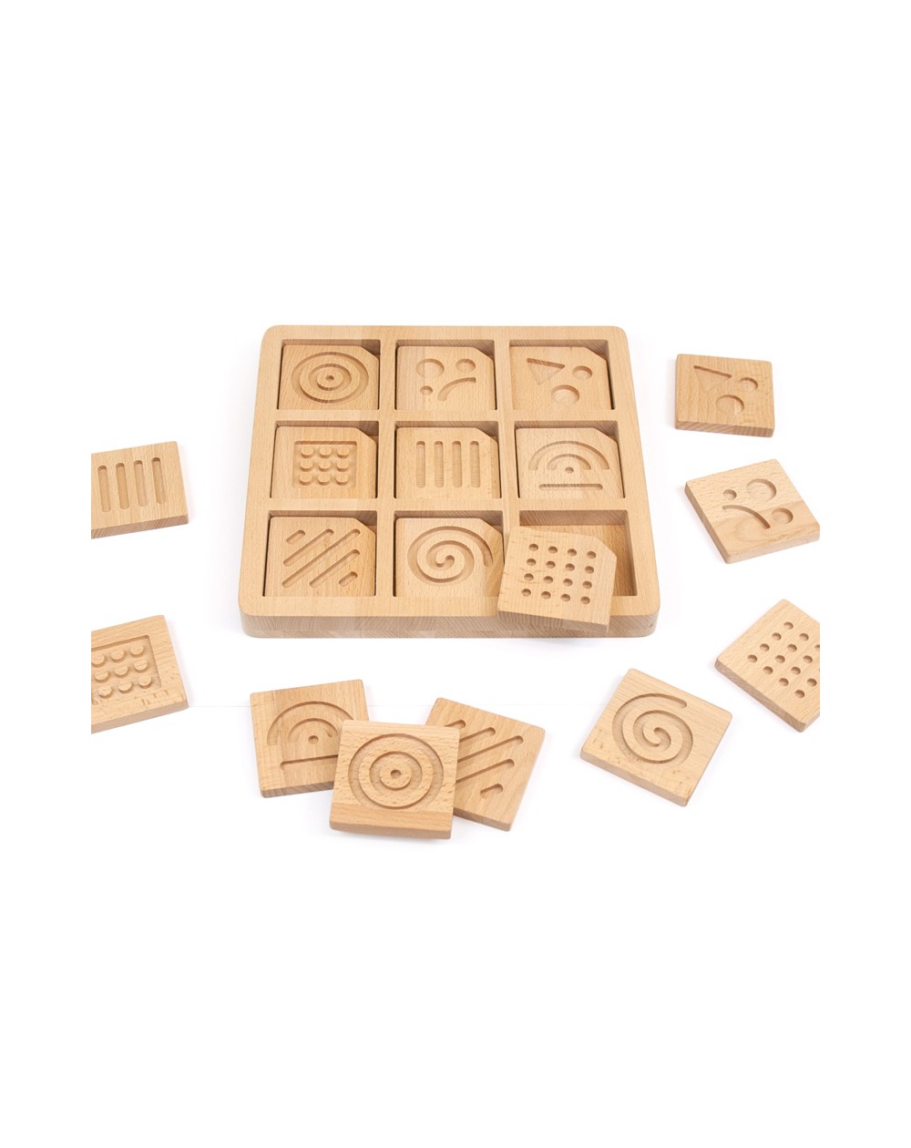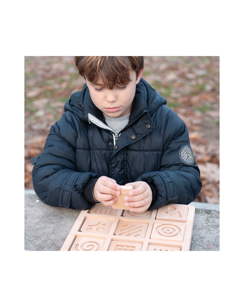 Jogo de Puzzle sensorial de memorando. Use o tabuleiro para colocar, na ordem que preferir, as 9 peças com as formas sensoriais gravadas. Em seguida, fora do tabuleiro, vire ou vire para baixo as outras nove peças gravadas que são gêmeas. O objetivo do jogo é combinar as diferentes peças do tabuleiro, utilizando a estimulação sensorial.