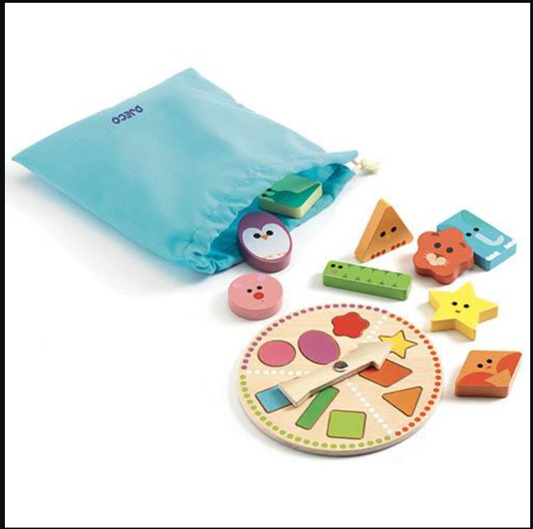 . Caixa: 14 x 14 x 3 cm. Inclui 9 peças geométricas, 1 saco e 1 roleta. Coloca as 9 peças no saco e abana-o, para as misturares. De seguida, gira a roleta e vê que figura geométrica te calha. Agora, sem olhar lá para dentro, coloca a mão dentro do saco e tenta encontrar, através do tato, a figura geométrica que te calhou.